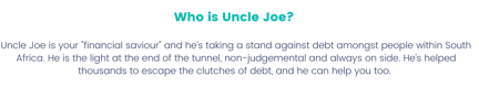 Uncle Joe is your “financial genie with attitude”, he’s your “feet on the ground”, honest, non-judgemental “says it as it is” finance champion. He’s attacking debt with a vengeance and is taking no prisoners. Uncle Joe was created with 1 goal in mind, free South African Residents from the jaws of debt. Every second you wait is robbing you of precious life moments. Break Free.